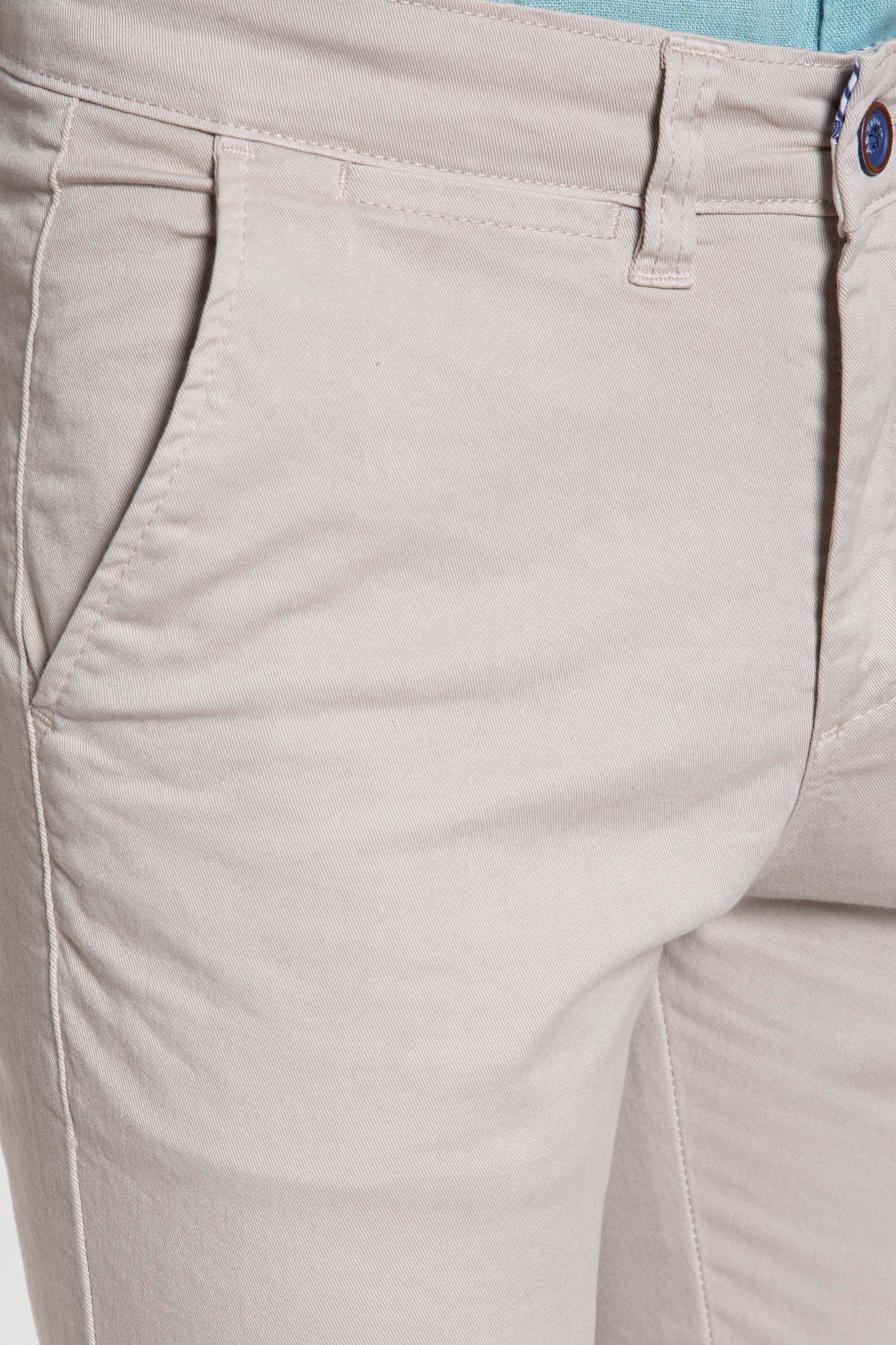 Pantalón chino básico, confeccionado en tejido de algodón con aporte de licra que proporciona comodidad, flexibilidad y un ajuste confortable.