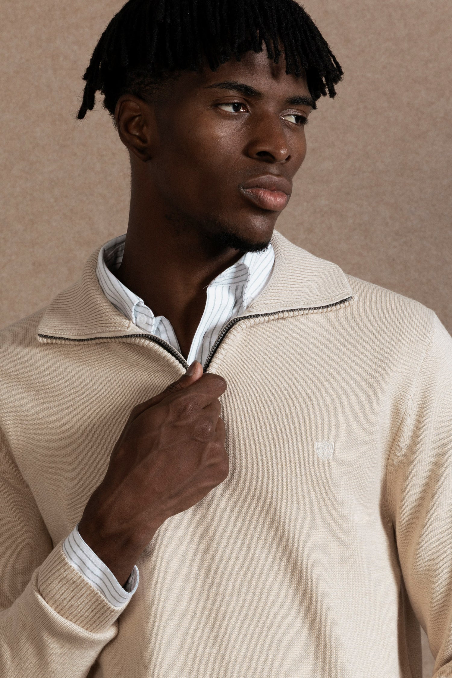 Este jersey de cuello cremallera en color Beig, parte de la línea Raíces de A LA VAQUERA, se presenta como una prenda básica y atemporal. Su tejido lo convierte en una opción perfecta para el otoño o para combinar con una camisa, ofreciendo versatilidad y comodidad en cualquier ocasión. Diseñado para adaptarse a todo tipo de estilos, este jersey aporta elegancia discreta y funcionalidad en el día a día.