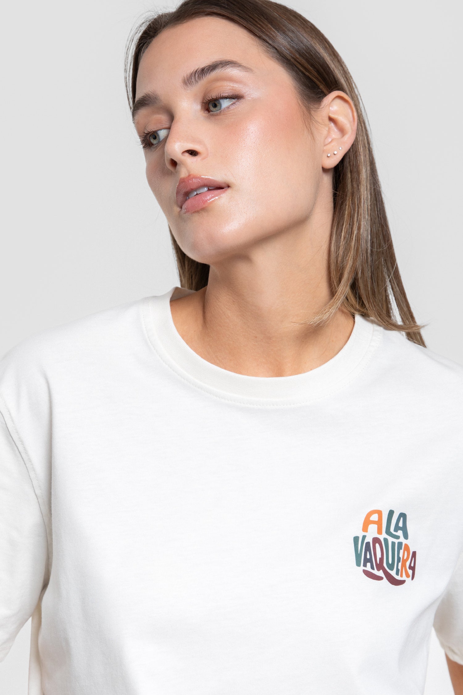 Camiseta oversize en tono crudo con estampado trasero exclusivo de A La Vaquera. Su diseño combina tipografía en contraste y colores vibrantes que aportan personalidad y ese aire desenfadado que define nuestra esencia.