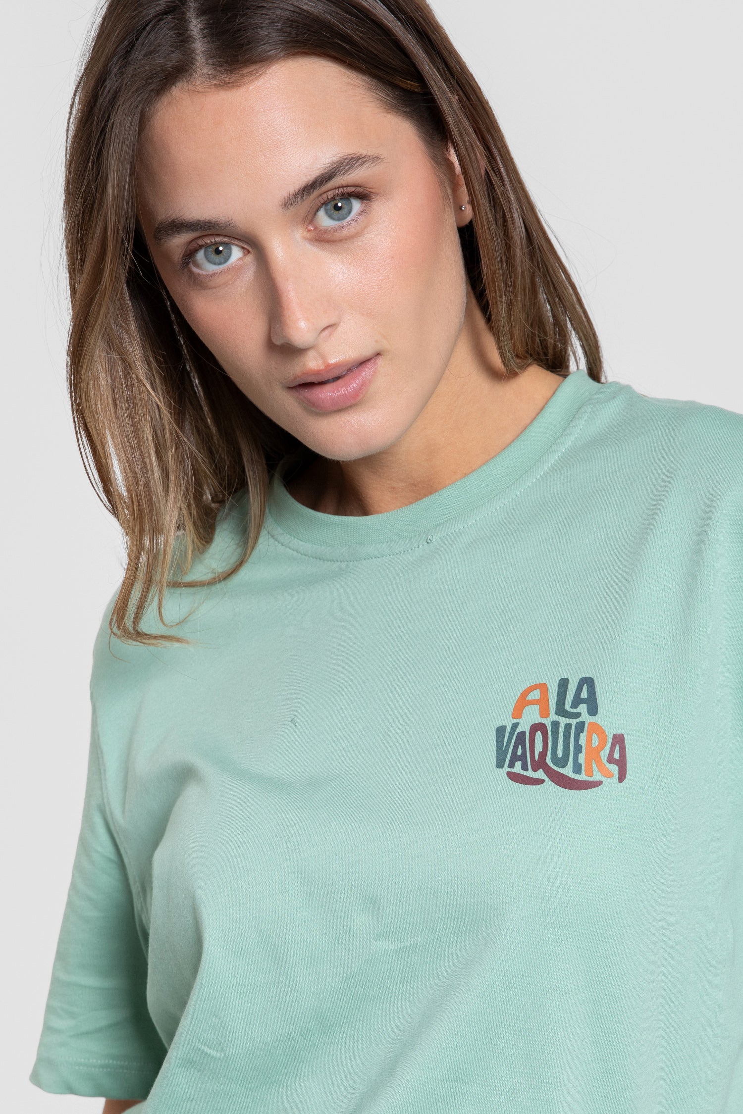 Camiseta oversize en tono verde agua con estampado trasero exclusivo de A La Vaquera. Su diseño combina tipografía en contraste y colores vibrantes que aportan personalidad y ese aire desenfadado que define nuestra esencia.