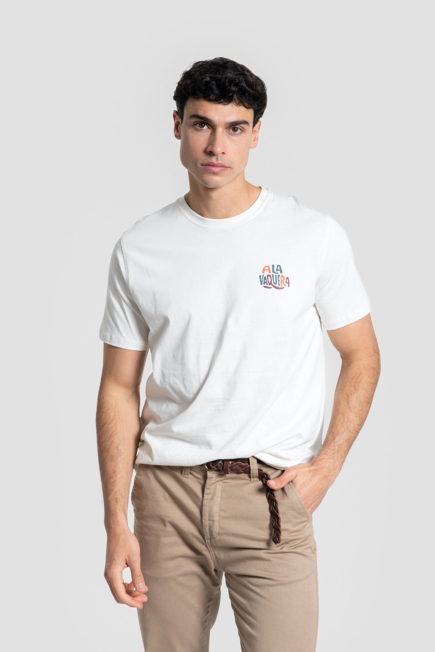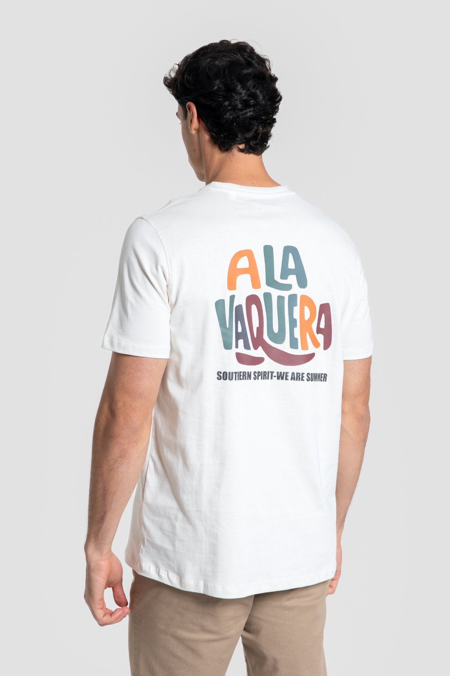 Camiseta oversize en tono crudo con estampado trasero exclusivo de A La Vaquera. Su diseño combina tipografía en contraste y colores vibrantes que aportan personalidad y ese aire desenfadado que define nuestra esencia.