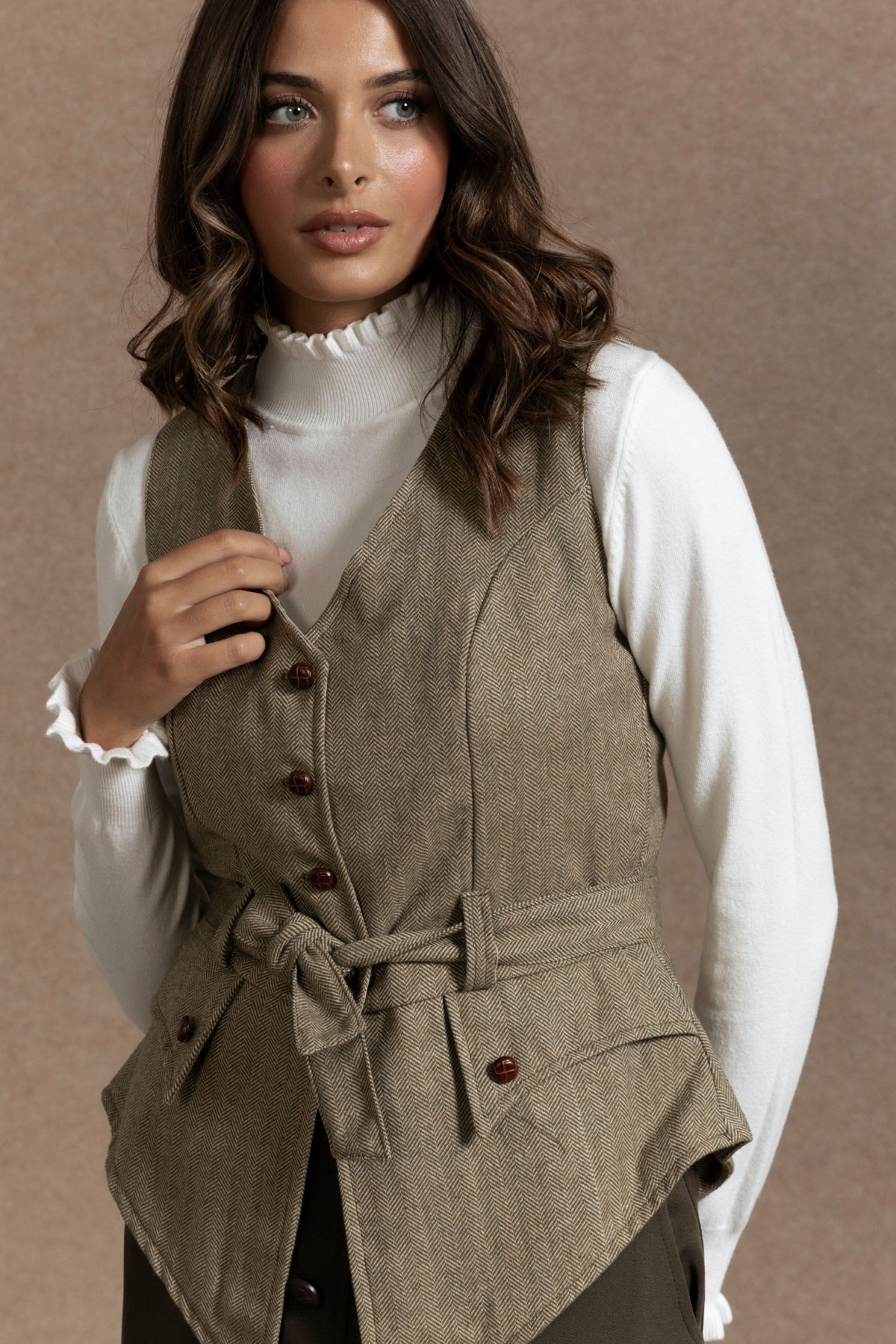 Chaleco de espiga para mujer en elegante tono kaki, diseñado con una sofisticada apertura frontal con botones y un favorecedor cuello en V. Su patrón de espiga aporta textura y distinción, convirtiéndolo en una pieza versátil para complementar múltiples conjuntos tanto formales como casuales.