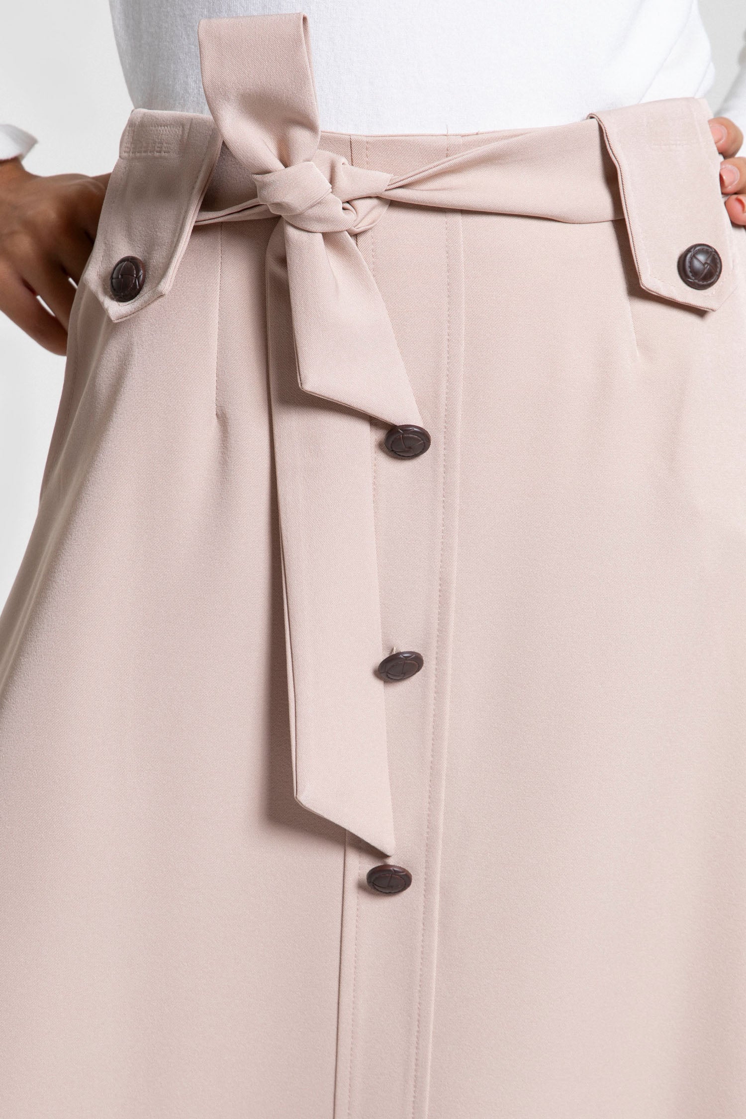 Falda larga femenina en tono hueso, diseñada con un tejido ligero que proporciona movimiento y fluidez. Presenta una cintura elástica decorada con botones ornamentales y un cinturón a juego que se anuda elegantemente en la parte delantera. Su corte suelto garantiza comodidad sin sacrificar estilo, ideal para eventos festivos como romerías o para un look veraniego sofisticado con un toque tradicional.