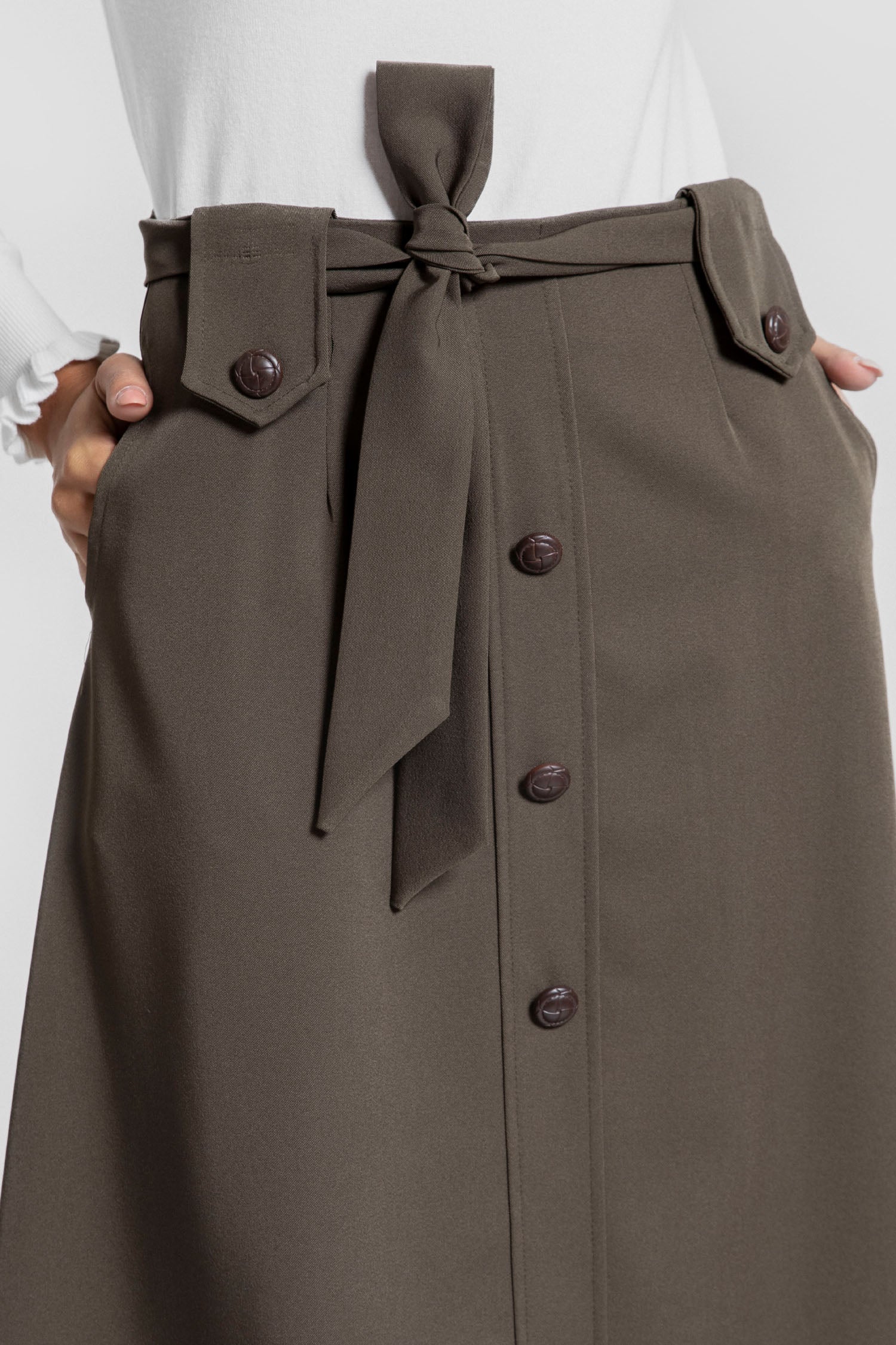Falda larga femenina en tono kaki, diseñada con un tejido ligero que proporciona movimiento y fluidez. Presenta una cintura elástica decorada con botones ornamentales y un cinturón a juego que se anuda elegantemente en la parte delantera. Su corte suelto garantiza comodidad sin sacrificar estilo, ideal para eventos festivos como romerías o para un look veraniego sofisticado con un toque tradicional.