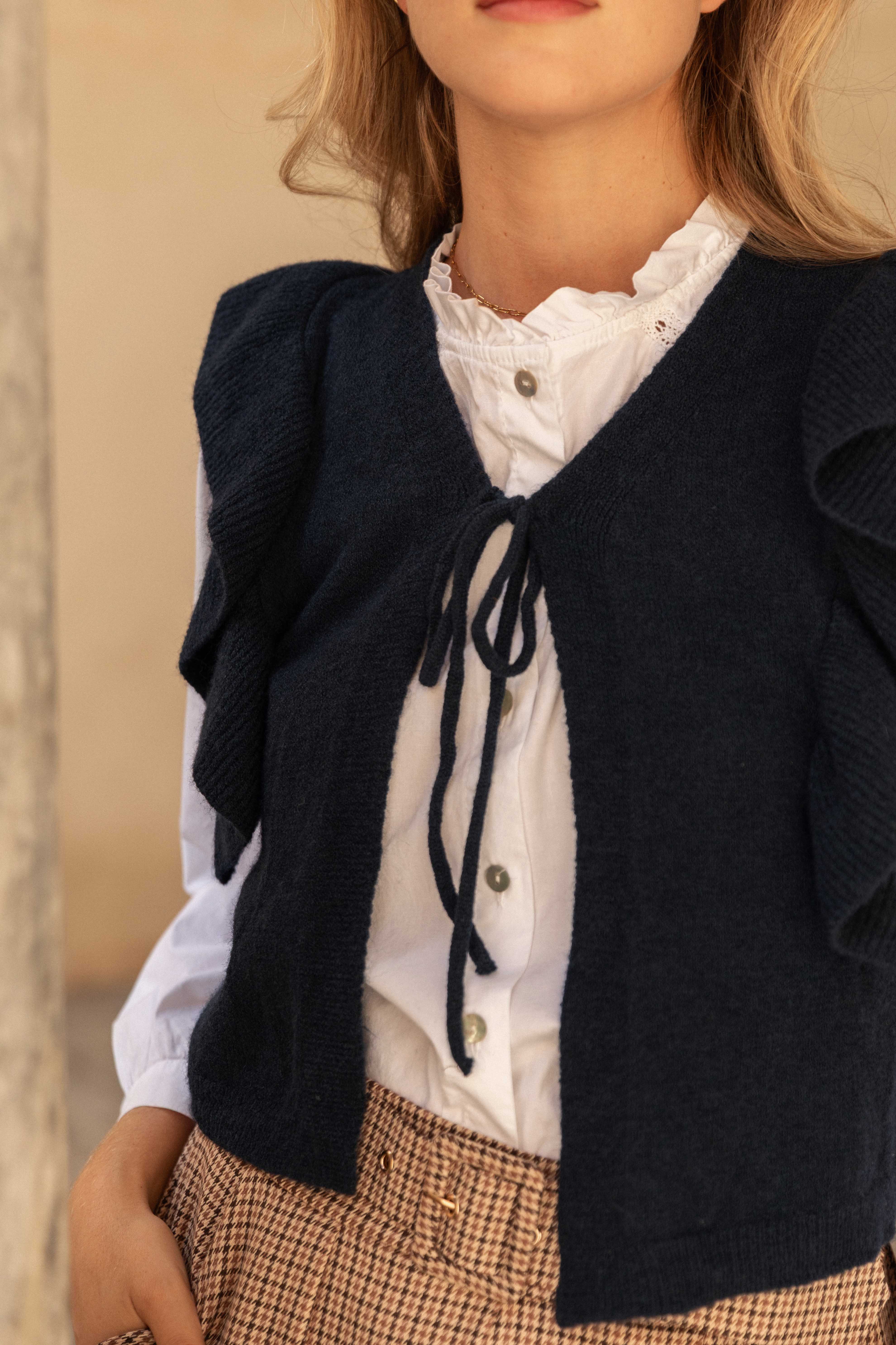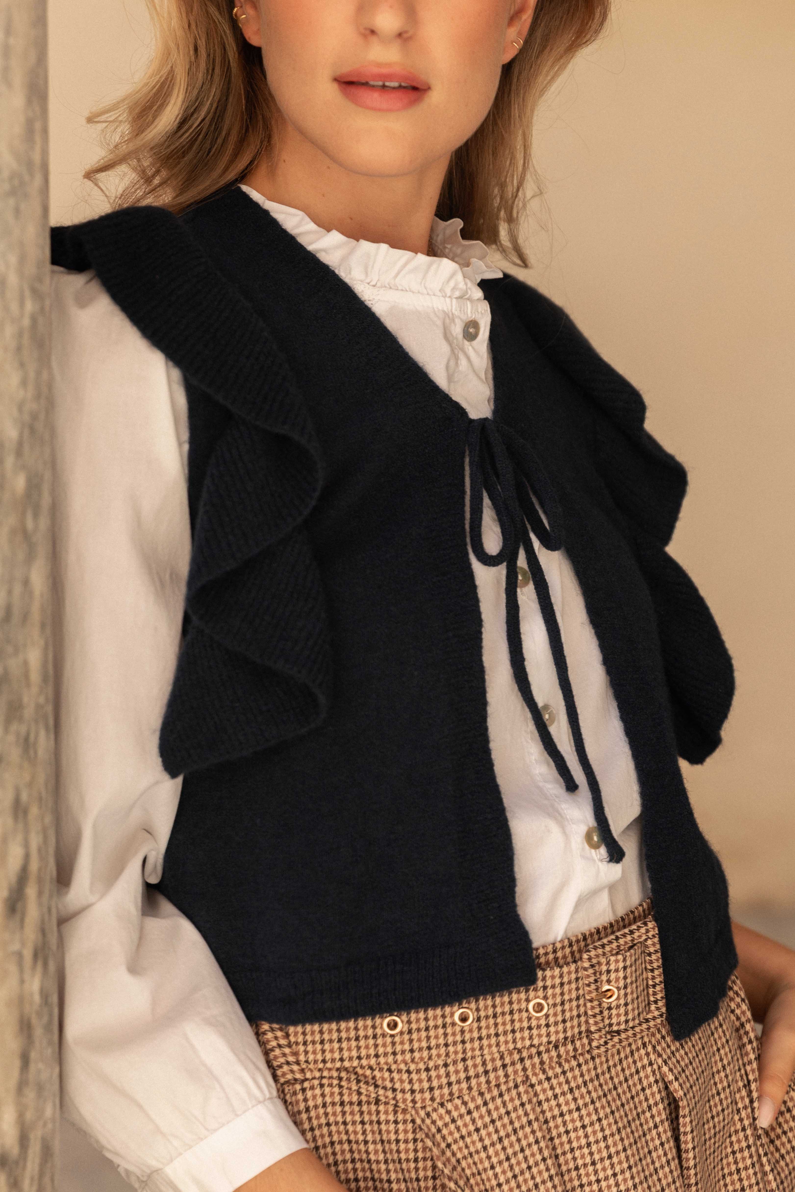Este jersey de punto sin mangas combina elegancia y comodidad con su diseño cuidado. La apertura con lazo permite un ajuste personalizado, mientras que los volantes en los hombros aportan un toque distintivo y sofisticado. Perfecto para quienes buscan una prenda versátil que realce cualquier look.