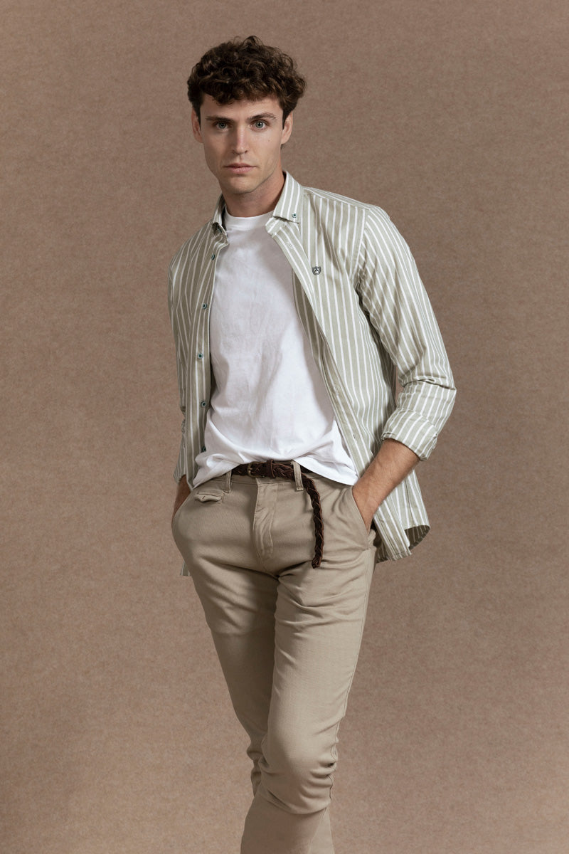 La elegancia está en los detalles. Esta camisa de rayas botella con cuello button down combina el confort del algodón 100% con un estilo limpio y atemporal. Perfecta para la oficina o para un look casual refinado.