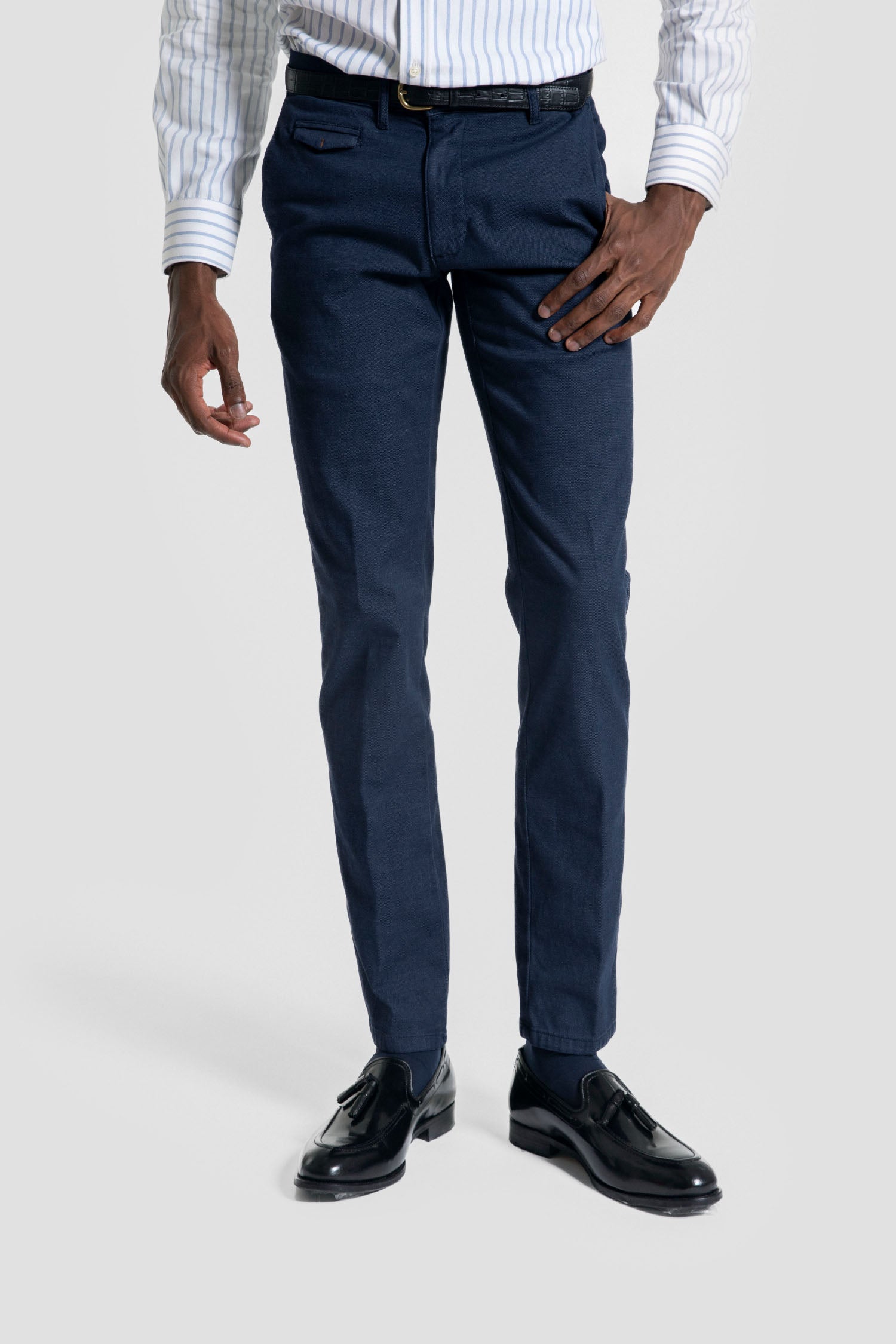 Este pantalón chino azul marino combina un corte clásico con un tejido suave y resistente, ideal para cualquier ocasión, desde el entorno laboral hasta salidas informales. Su diseño versátil permite un ajuste cómodo y favorecedor, mientras que el color azul marino aporta un toque de elegancia discreta. Perfecto para quienes buscan estilo y funcionalidad en una sola prenda.
