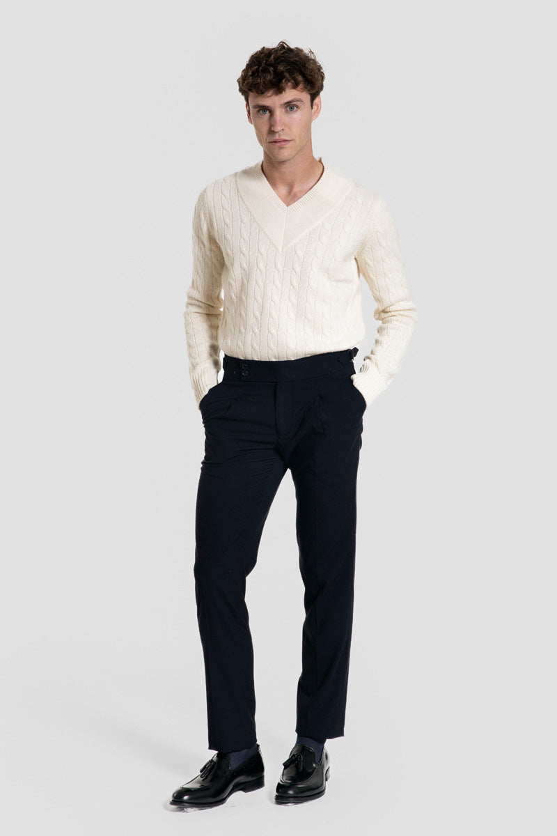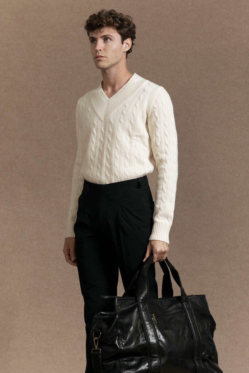 Envuelve tu estilo en confort auténtico. Nuestro jersey de lana 100% color hueso, con cuello en V y dibujo de ochos ofrece un toque clásico, elegante y cálido. Perfecto para el día a día o para elevar cualquier look con sencillez y distinción.