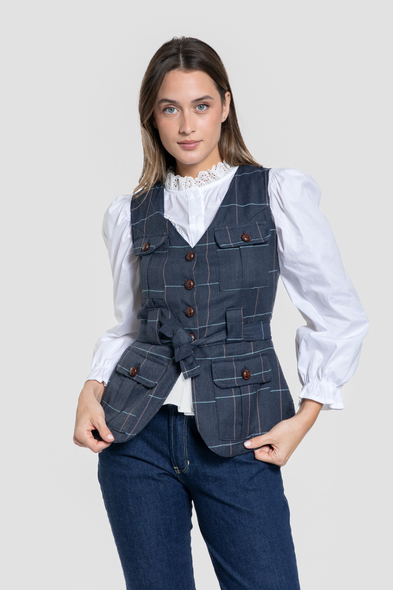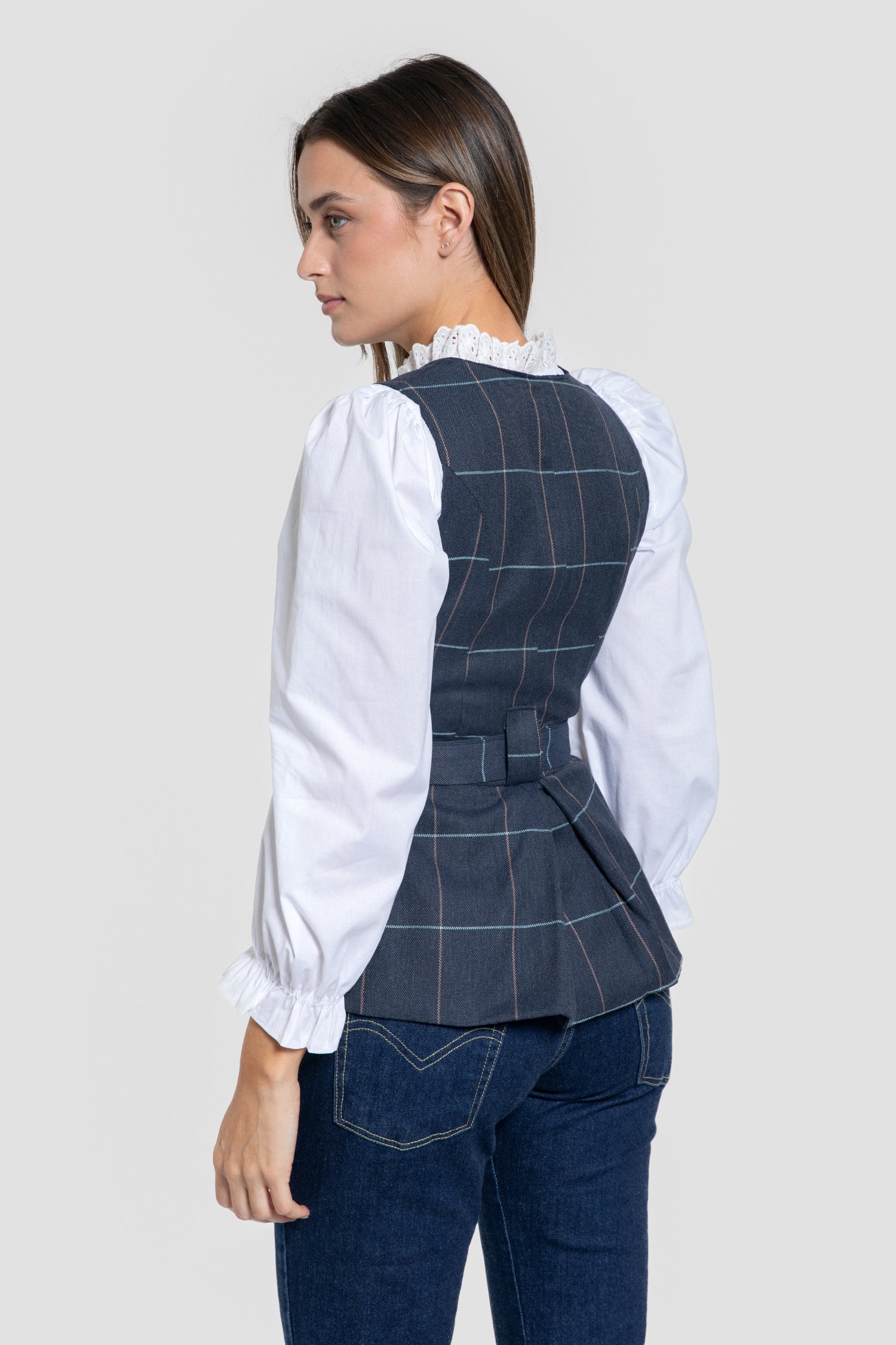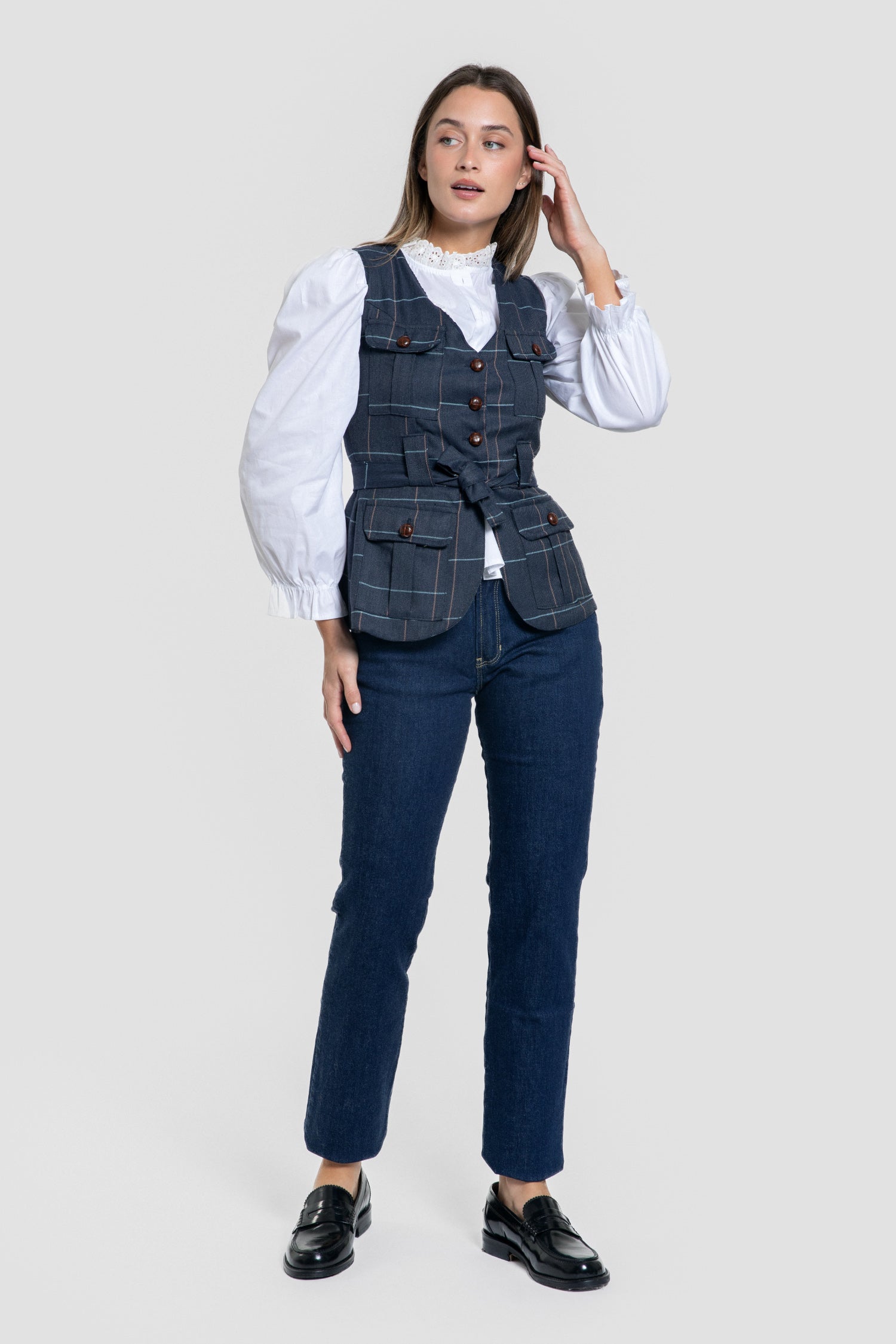 Chaleco de diseño estructurado con estampado de cuadro fino y cierre frontal con botones. Incorpora bolsillos delanteros y cinturón ajustable que estiliza la silueta, aportando un toque elegante y moderno.