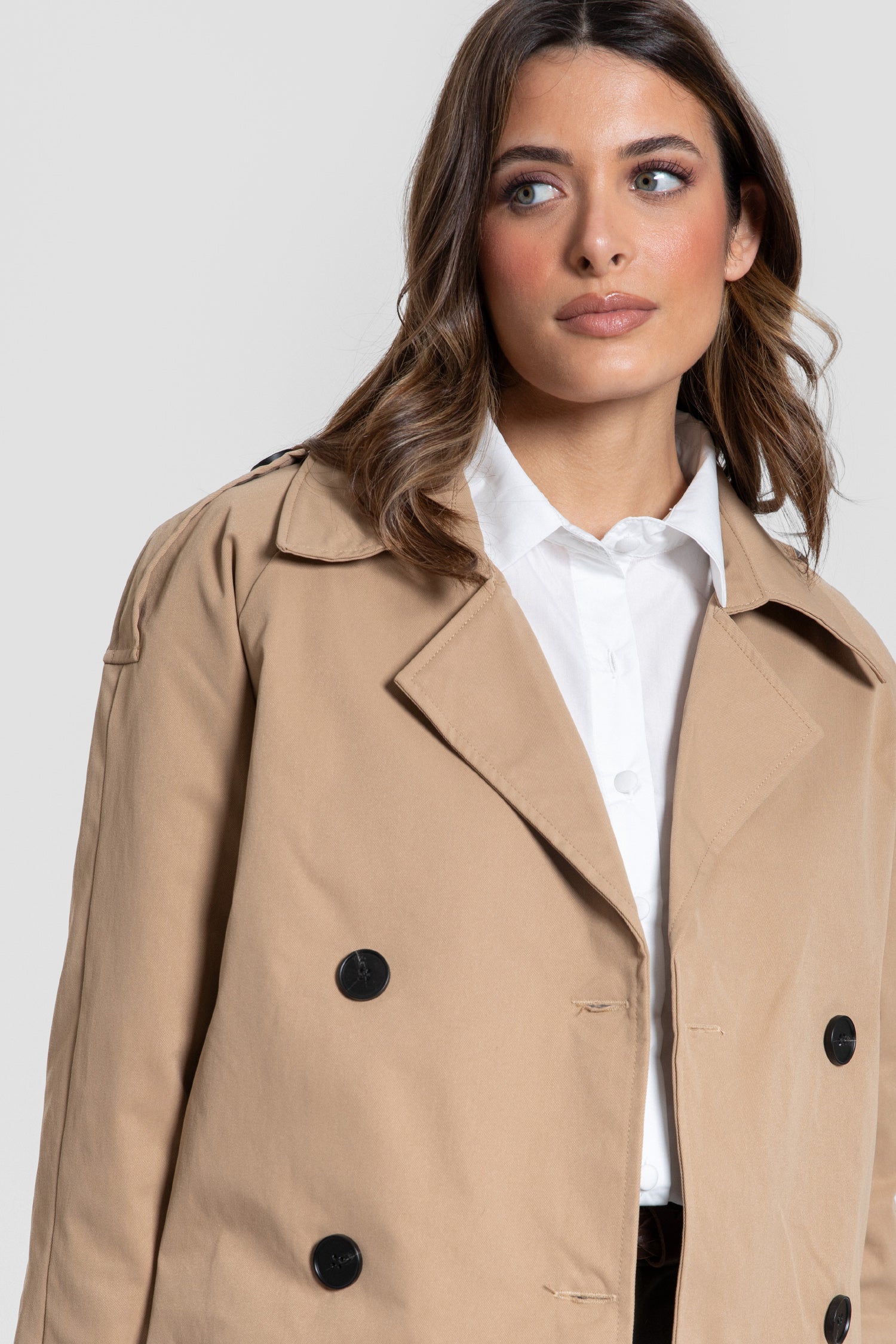 Esta chaqueta corta en color camel es perfecta para un look elegante y sofisticado. Su diseño de corte recto y botones negros le da un toque moderno y refinado. Ideal para combinar con tus looks de oficina o para un día casual, esta chaqueta se adapta fácilmente a cualquier estilo.