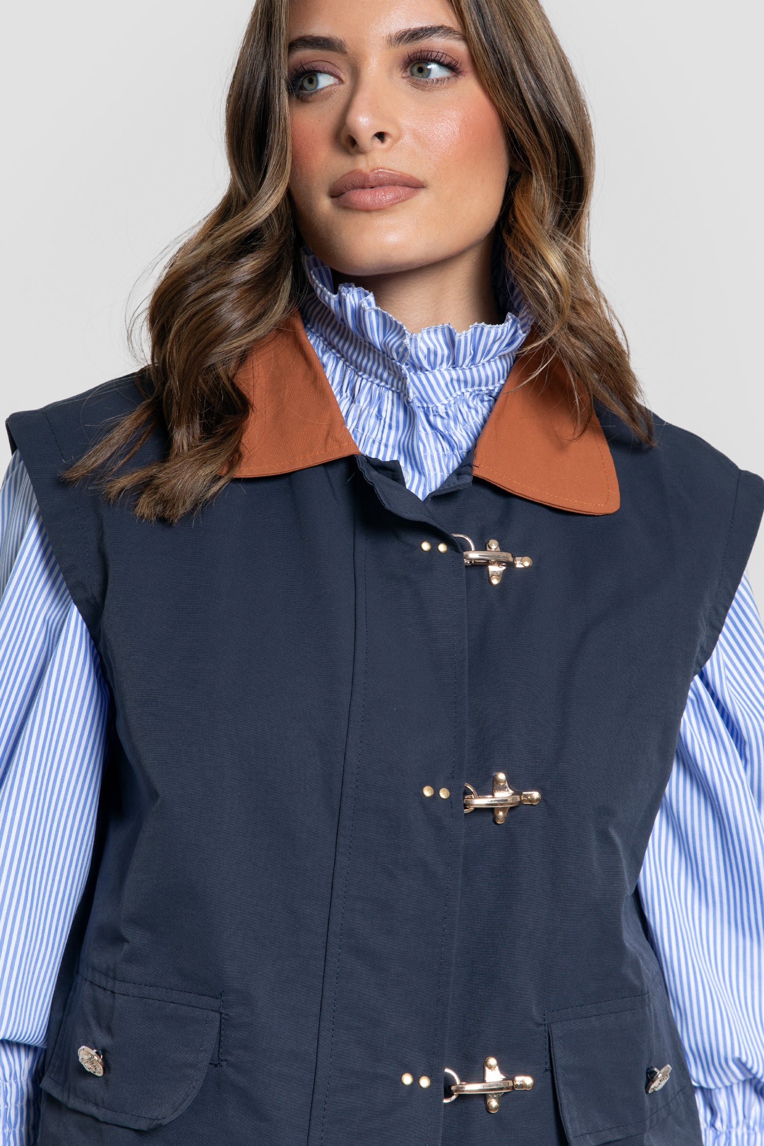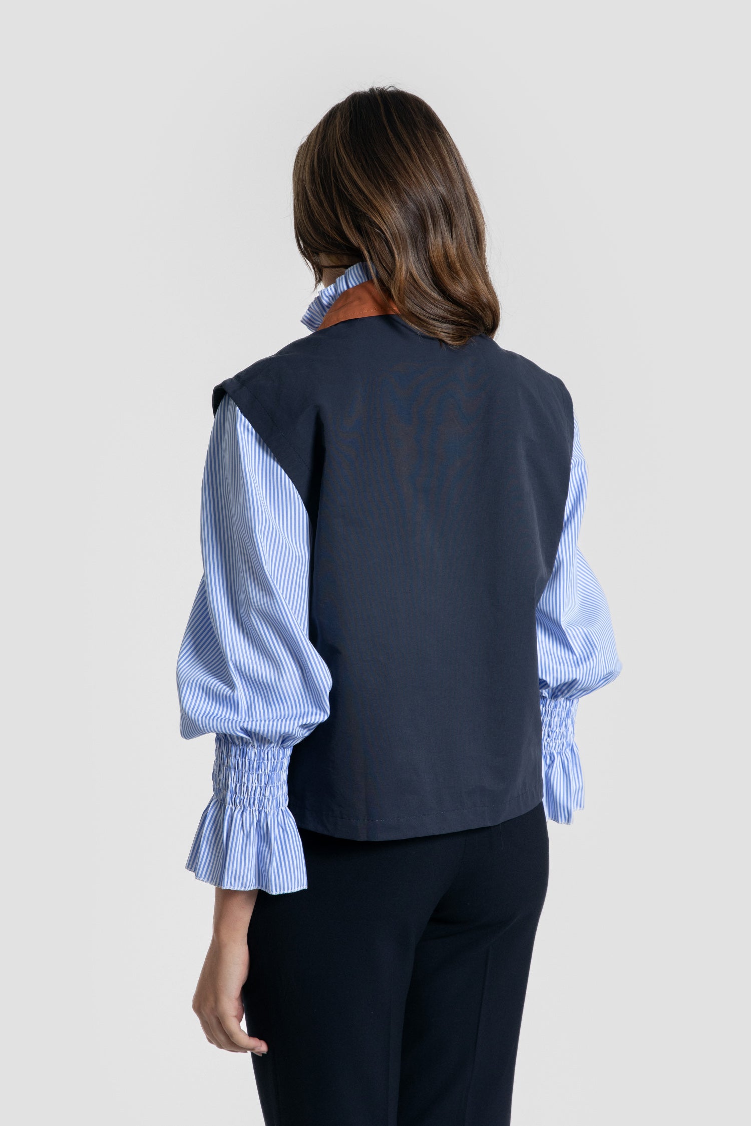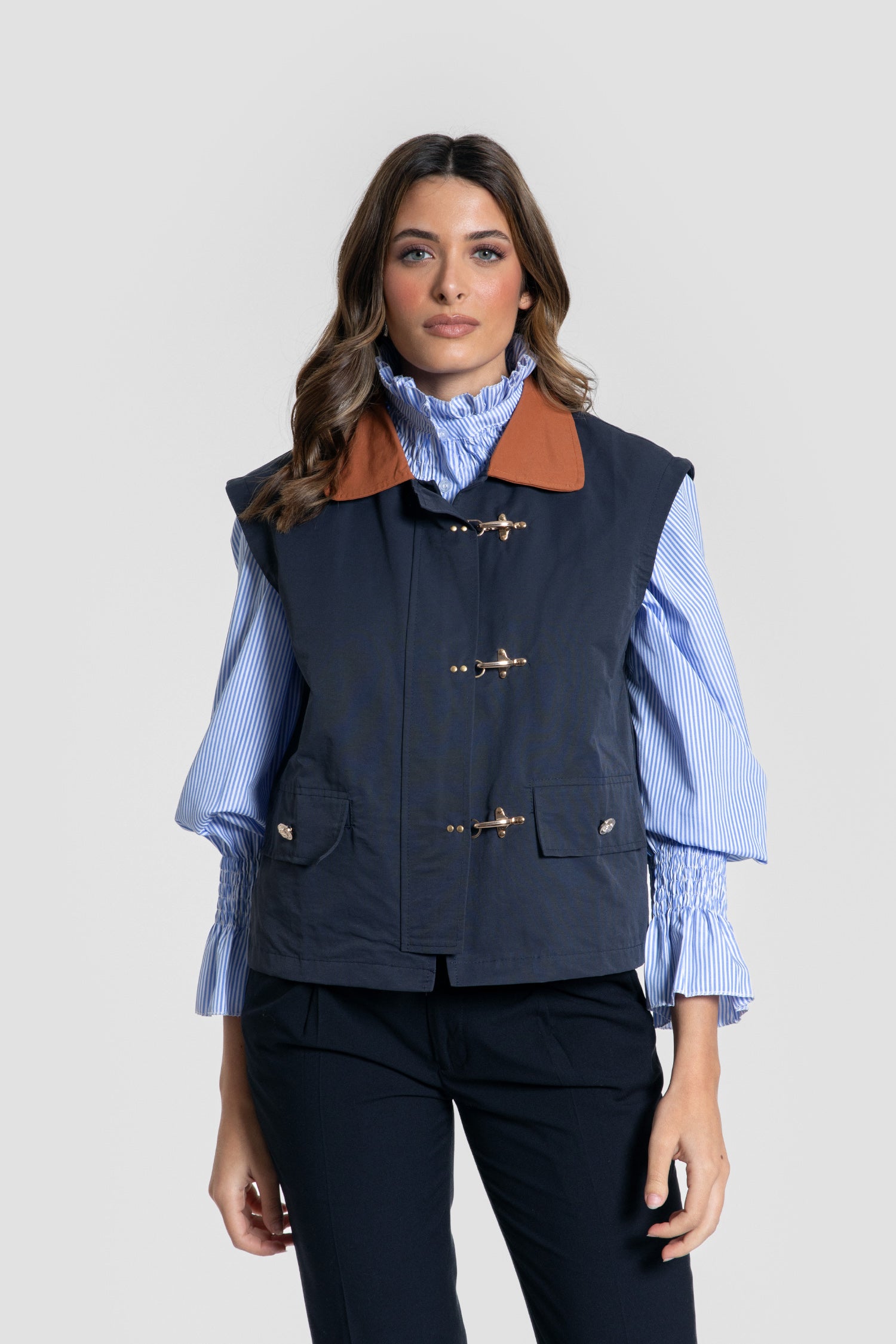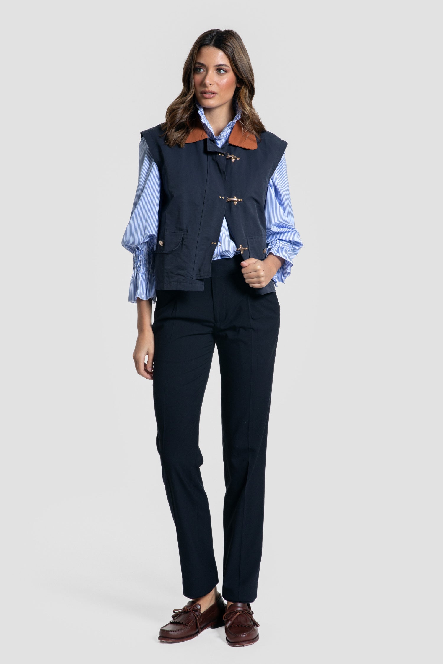 Chaleco con cuello en contraste, en marino, es una pieza que destaca por su elegancia y carácter distintivo. Su diseño incorpora un cierre frontal con botón dorado tipo enganche, un detalle sofisticado que aporta personalidad y refuerza su estética cuidada. Confeccionado en un tejido estructurado y de excelente caída, es perfecto para elevar cualquier look con un aire atemporal y refinado.