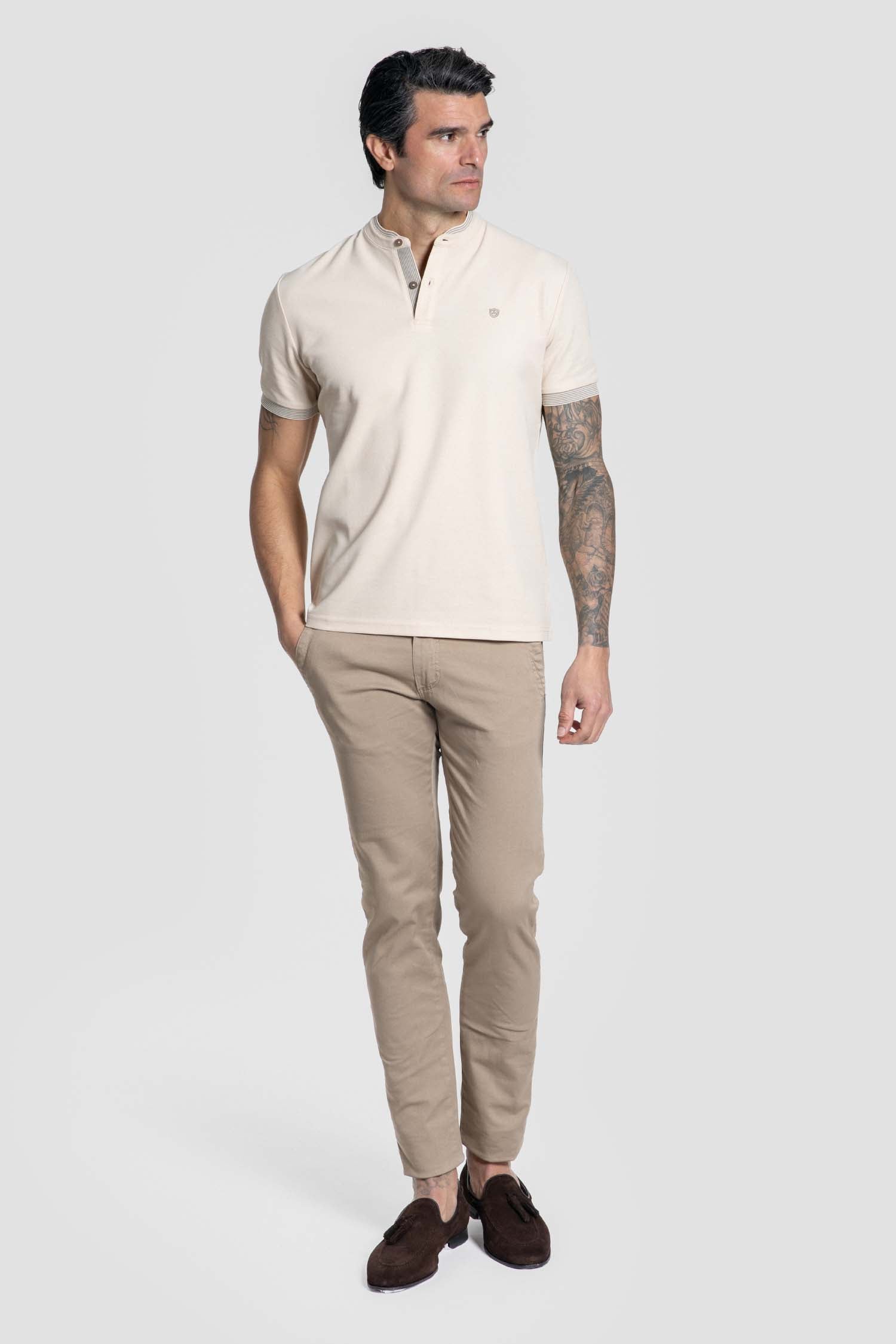 Pantalón chino camel para hombre de corte regular, diseñado para ofrecer comodidad, elegancia y libertad de movimiento gracias a su tejido con licra. Incorpora cierre central con botón y cremallera para un ajuste seguro y funcional. Cuenta con bolsillos traseros tipo chino y un pequeño bolsillo trasero con tapeta que aporta un sutil detalle distintivo. Un básico versátil y atemporal, ideal para looks formales o casuales, perfecto para el uso diario.