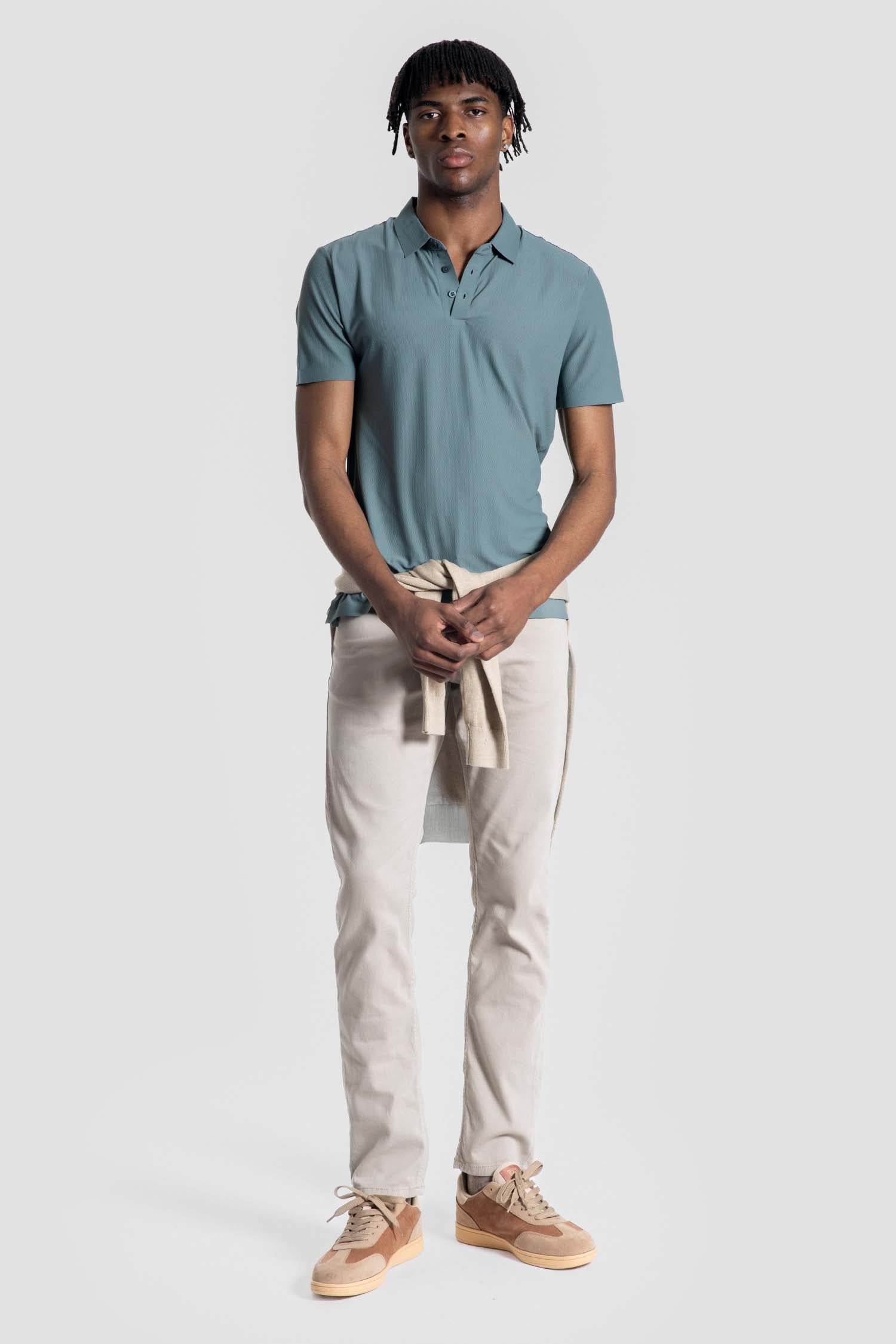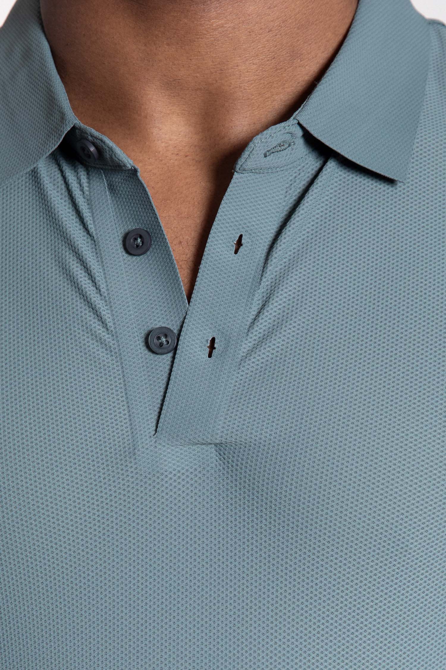 Polo de manga corta en color petróleo de diseño limpio y contemporáneo pensado para colecciones de alta rotación y uso transversal