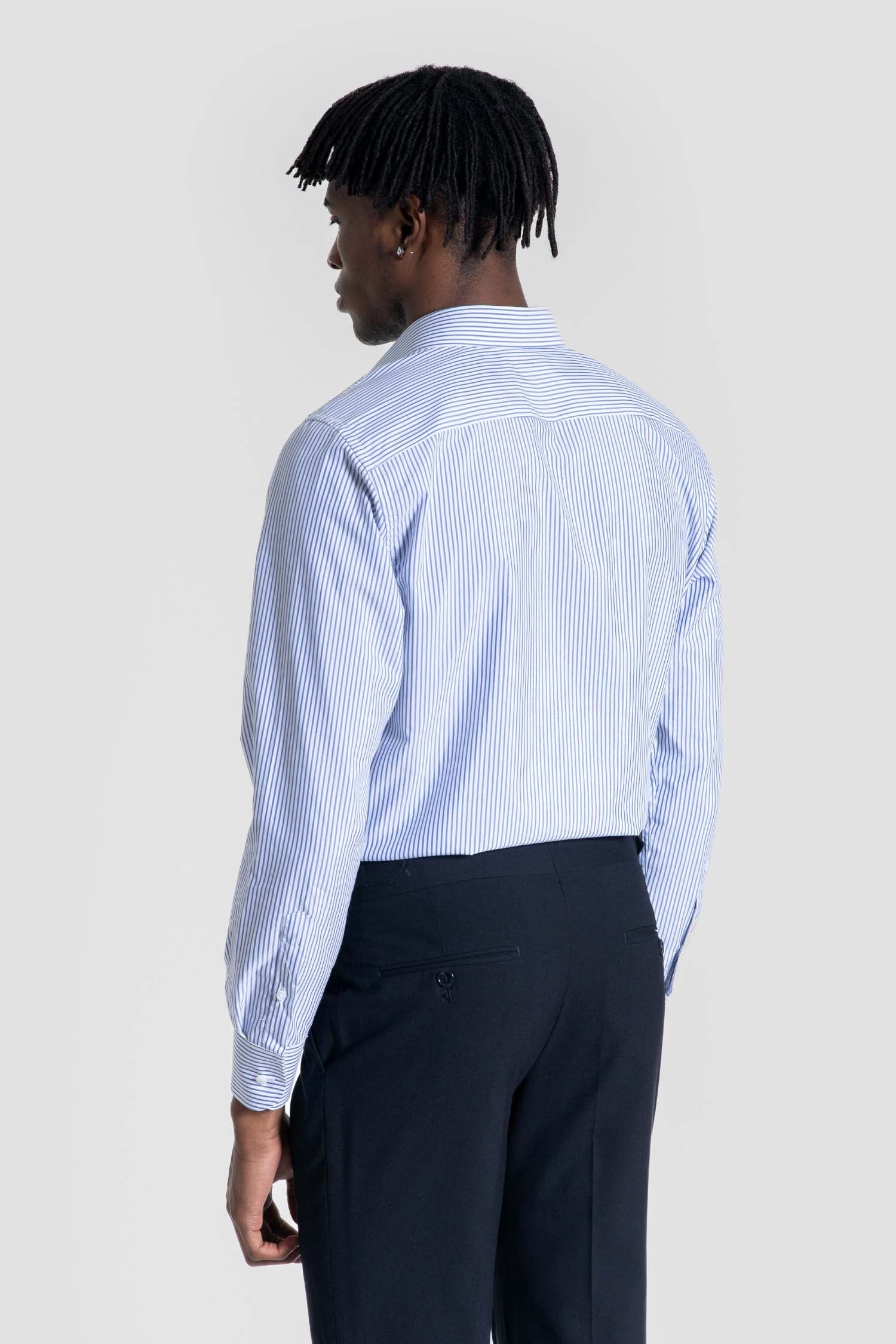 La camisa de rayas en tonos celeste de A LA VAQUERA destaca por su diseño atemporal y su elegancia natural. El escudo bordado a juego aporta un detalle distintivo y sofisticado que eleva la prenda sin perder su esencia versátil.